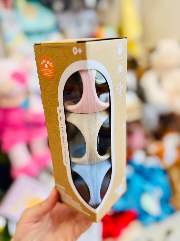 Oibo – an elastic, stackable, rollable, squeezable, easy-to-grip sensory toy for babies and kids of all ages.