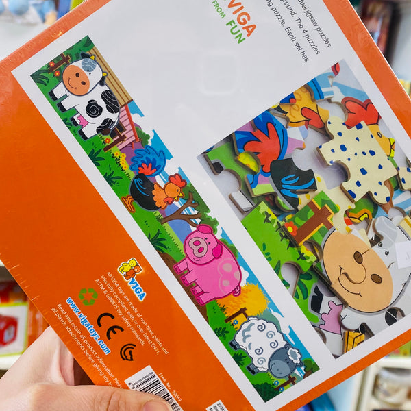 4 individual jigsaw puzzles of farm animals with background. The 4 puzzle can be made up to a long puzzle