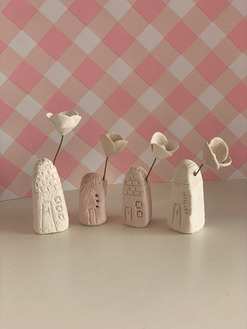 Mini Clay Houses with Flower- Handmade & Unglazed