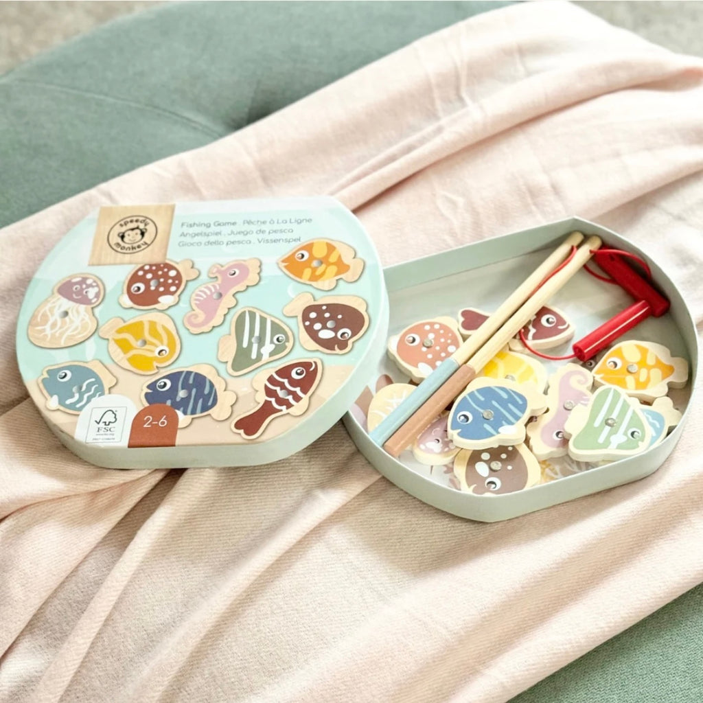 Grab the fishing rod and 'hook' these colourful wooden fish with the magnetic wooden rods. The 2 rods included encourage social play. Build fine motors skill and concentration in catching each fish. This toy is crafted from sustainably sourced wood from FSC® certified forests and coated with non-toxic paint.
